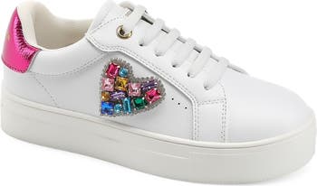 Rainbow-hued crystals bring kid-approved sparkle and signature style to this easy-on leather sneaker topped with stretchy laces and cushioned with memory foam.