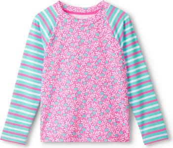 Keep your little one protected from the sun's rays in this colorful beach-themed rashguard featuring long sleeves and bold contrast stripes.