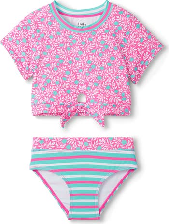 Keep your little one protected from the sun's rays in this colorful beach-themed swimsuit featuring a tankini top and coordinating bottoms.