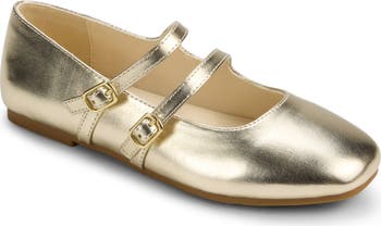 Dual mary jane straps offer adorable charm and a secure fit on a metallic flat grounded by a slip-resistant rubber sole.
