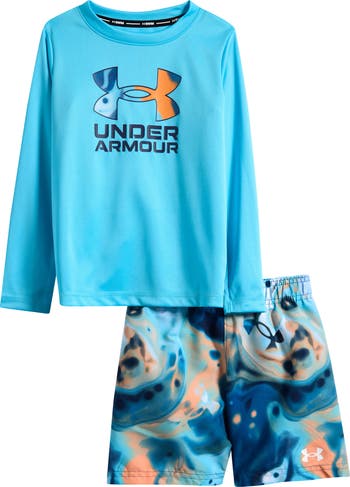 Get your favorite kiddo ready to splash and play in this two-piece swimsuit featuring a long-sleeve rashguard and coordinating trunks featuring built-in sun protection. The rashguard boasts a tag-free design, and the trunks have a supersoft suede-inspired finish that resists water, salt and chlorine.