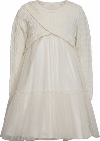 Your little partygoer will look picture-perfect in a dress that starts off like a sweet sweater and ends in a froth of festive tulle.