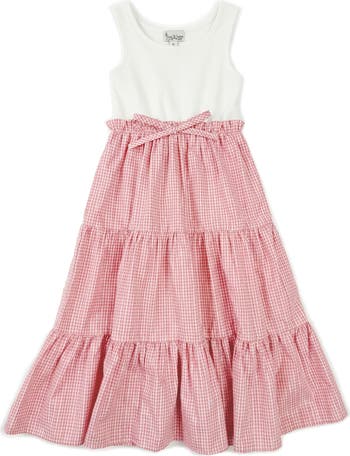A fixed bow details the front of this breezy party dress made with a stretchy ribbed bodice and a tiered seersucker skirt.