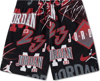 An explosion of Jordan logos and jersey numbers brings big hoopster energy to basketball shorts that take your kid from the game to the sidelines in easy comfort. Made of breathable mesh, they feature a stretchy waist and a roomy fit for easy movement in any activity.