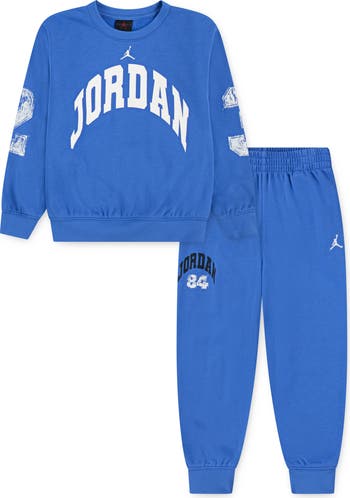 Brushed for added softness, cotton-rich fleece keeps kids comfy from the classroom to the couch in this sporty set with paint-chipped graphics honoring the GOAT behind the brand. An embroidered Jumpman details the joggers, inspiring young hoopsters to shoot for the stars.