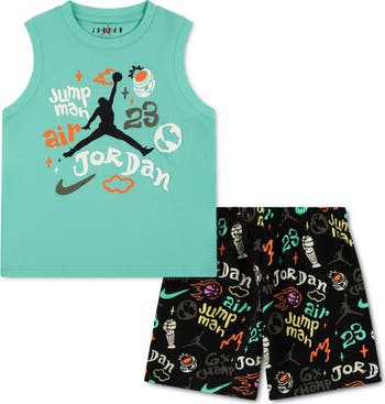 Jumpman iconography inspires young hoopsters to shoot for the stars in this tank and shorts set that keeps them comfy from classroom days to practice and beyond.