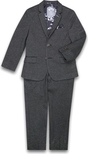 A classic herringbone pattern in shades of charcoal grey keeps your child looking dapper at formal and semiformal occasions in a two-piece suit that's crafted with plenty of stretch for easy-wearing comfort. The trim tailoring and flat-front trousers add timeless detailing, while the partial lining makes it easy to layer.