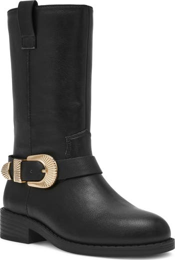 A beveled buckle brings a moto aesthetic to a kid-approved boot shaped from faux leather and featuring a foam-cushioned footbed for lasting comfort.