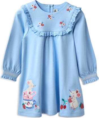 They'll love the playful teaparty-themed appliqués on this soft cotton party dress with a ruffle-trimmed yoke and smocked cuffs.