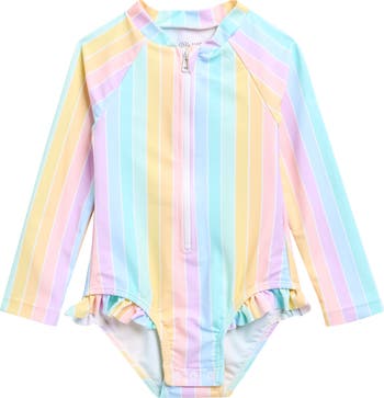 Stripes and ruffles bring playful charm to a one-piece swimsuit made with long sleeves that block out the sun, sand and surf.