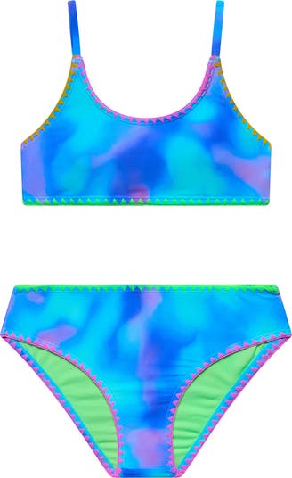 Whipstitch embroidery outlines this two-piece swimsuit made from a quick-drying fabric with a cool pattern that is kid approved.