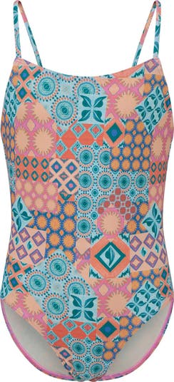 A strappy design with stretchy details ensures a comfortable fit as they paddle and splash in this one-piece swimsuit.