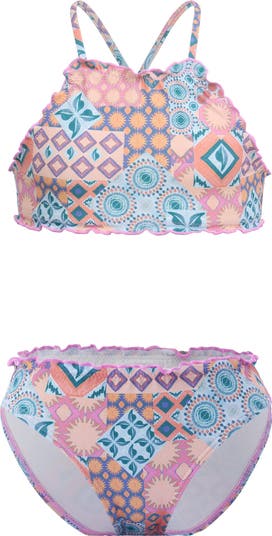 They'll love lounging poolside in this two-piece swimsuit featuring lettuce-edge trim and a playful print.