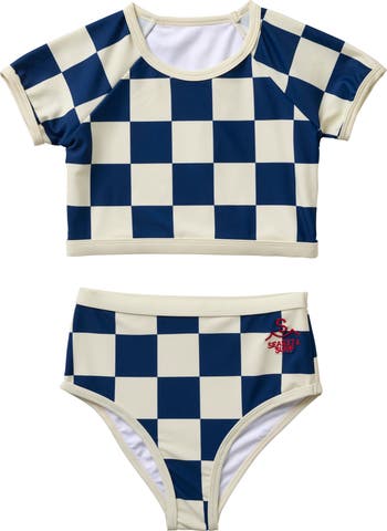 Your young beachgoer will love to seek out the waves in this two-piece swimsuit topped by a raglan-sleeve rashguard.