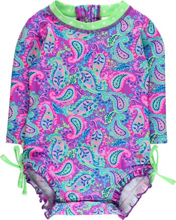 Colorful paisleys pattern a long-sleeve rashguard swimsuit featuring signature ruffles across the derriere.