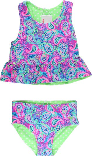 Your little one will look adorable splashing in this reversible two-piece featuring a ruffled tankini top and coordinating bottoms.