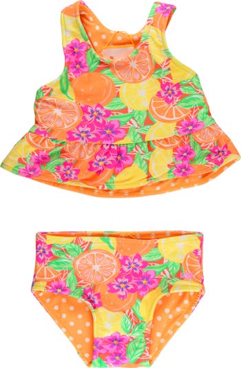 Your little one will look adorable splashing in this reversible two-piece featuring a ruffled tankini top and coordinating bottoms.