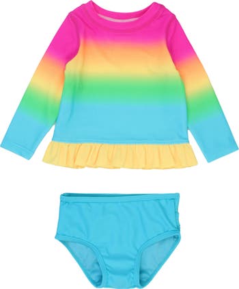 Signature ruffles lend playful energy to this vibrantly hued two-piece swimsuit with a long-sleeve rashguard and coordinating bottoms.