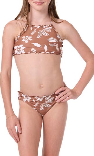 Watch your kiddo splash and play in this cute two-piece with ruffled trim and a tropical floral pattern.