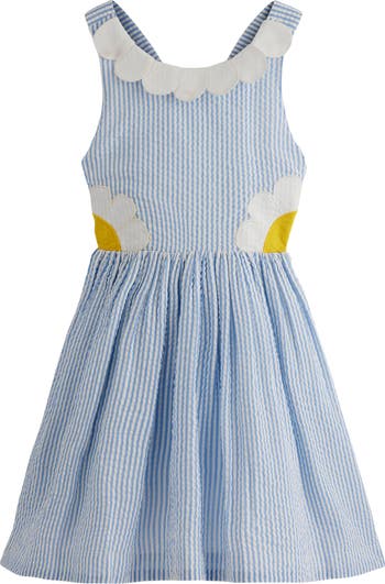 They'll enjoy backyard parties and outdoor events in this airy cotton sundress styled with a pleated skirt, crisscross straps and summery appliqués.