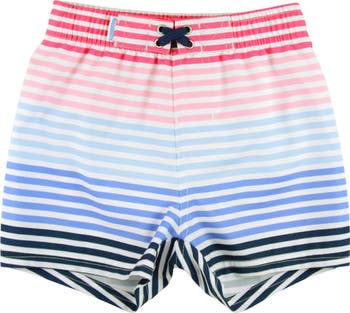 Colorblocking and bold stripes pattern these kid-sized swim trunks with built-in sun protection to keep them splashing playfully just a bit longer.