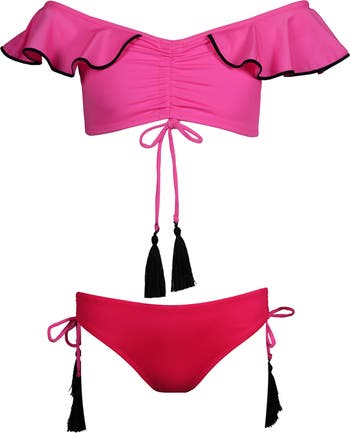 Kids' Off-Shoulder Bikini with Gathered Front & Tassel Ties