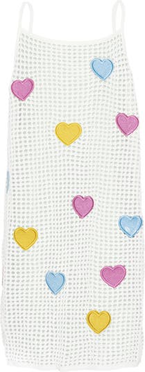 Colorful hearts pop on a breezy crochet cover-up perfect for days spent at the beach or pool.