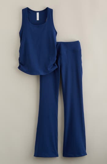 Soft and stretchy rib-knit fabric keeps your child comfortable on the mats in a set that pairs a side-ruched racerback tank with flowy pants finished with a wide waistband.