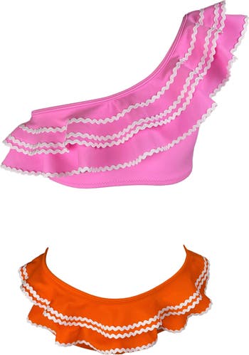 Kids' One Shoulder Pink-Orange Multi-Layered Ruffle Two-Piece Swimsuit