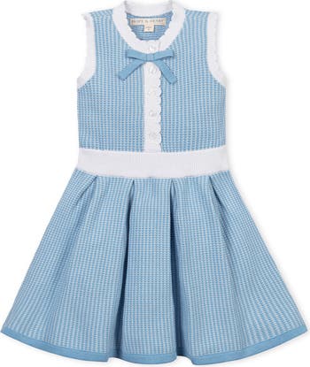Our tank sweater dress in soft organic cotton is a sweet, sophisticated take on spring style. Features contrast trim with scallop edge detail, a button front closure, and a girly bow at the neckline. Full skirt that she will love to twirl in.