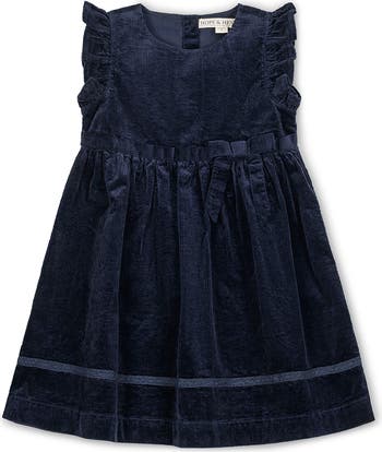 Our beautiful jumper dress is perfect for layering with tops and tights when school is back in session and temperatures begin to cool. Features sweet flutter sleeves, a bow detail at the waist, crochet trim, and a button back closure. Crafted from soft organic cotton fine wale corduroy that is a warm and rich look for the season.