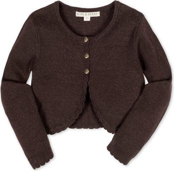 A beautiful layer to top off her dressy outfits. Our cropped cardigan sweater is knit in fine gauge organic cotton with full fashioning at the armholes and a lovely scallop edge trim at the cuffs and hem. Features a gold three-button closure at the front for just the right amount of coverage.