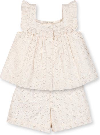 Our sweet summer set is crafted from soft organic cotton eyelet and ready for every summer adventure. Top features ruffled edges, a swing silhouette, and a button front closure. Short is a pull-on silhouette with elastic waist. Both pieces are lined in organic cotton for quality and comfort.
