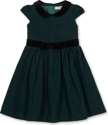 Cut from soft and chic organic cotton brushed flannel in a classic silhouette, this pretty dress will be your girl's go-to piece for picture time this holiday season. Features a velveteen peter pan collar, bow, and waist sash. Fully lined with a zipper closure down the center back for easy dressing.