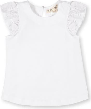 Flutter into spring in our feminine everyday top, which mixes a soft knit body with woven sleeves. Features flutter sleeves in a delicate woven eyelet, a soft and stretchy organic cotton jersey knit body, and a back keyhole neck closure with button for easy dressing.