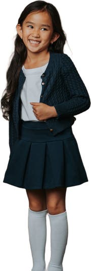Our adorable classic cable cardigan in soft organic cotton is a sophisticated wardrobe staple for your little lady. This is the piece that layers perfectly with anything from a dressy dress, to a school uniform, to t-shirt and jeans! Features gold shank buttons at the center front and two sweet little pockets.