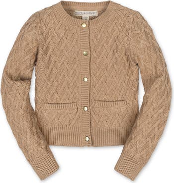 Our beautiful classic cardigan in soft organic cotton is a sophisticated wardrobe staple for your girl. Knit in a lofty herringbone cable, this piece layers perfectly with anything from a dressy dress, to a school outfit, to t-shirt and jeans. Features gold shank buttons at the center front and two sweet little welt pockets.