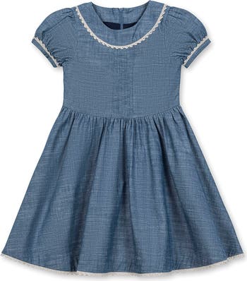 A beautiful goes-with-everything dress that transitions with ease from season to season. Features pintucking at the front bodice, a rounded collar with crochet trim, sweet puff sleeves, and a zipper closure down the center back for easy dressing. Crafted from soft organic cotton chambray. Picture perfect on its own or layered up with a cardigan and tights.