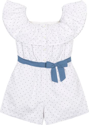 A sweet ruffle collar adds a special touch to our warm-weather romper in a beautiful organic cotton seersucker. Features a button closure at the center front, side pockets, waist sash with bow, and elastic at the waist for a comfortable fit. Fully lined in organic cotton. Get the camera ready for those picture perfect moments.