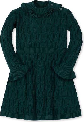 This beautiful piece combines the polish of a dress with the comfort of her favorite sweater (aka the best of both worlds). Features a cozy mock neck, ruffle details at the collar and cuffs, buttons at the shoulder, and an allover cable knit design. A special piece in soft organic cotton she will treasure.