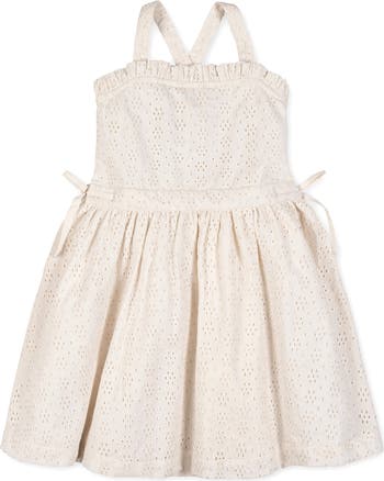 She'll be ready for every summer adventure in our airy organic cotton eyelet dress. Features feminine ruffle edges, cross back straps with adjustable buttons, and a button closure down the center back. A fun and fresh dress for the season ahead.