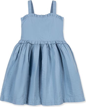 She'll be ready for every summer adventure in our airy organic cotton seersucker dress. Features feminine ruffle edges, straps with adjustable buttons, and a zipper closure down the center back. A fun and fresh dress for the season ahead.