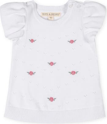 Our short sleeve pointelle sweater top is one of the prettiest pieces of the season. Features ruffle sleeves and a front bodice with pointelle knit and embroidered details for a sweet look.