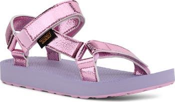 Shimmering straps bring a bit of magic to this playground-ready sandal that has an easy hook-and-loop closure and lightweight cushioning for added comfort.