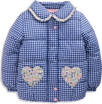 This quilted, padded jacket is the perfect transitional-weather style that helps your little one spring forward with its bright gingham print, frilly collar and heart-shaped pockets in a contrast floral print.