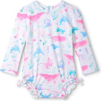 Make your little one's seaside days memorable in this fab ocean-themed one-piece swimsuit framed by protective long sleeves.