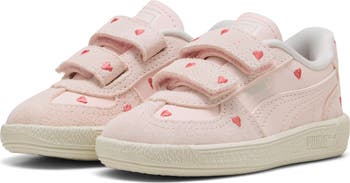 A low profile and classic T-toe keep the soccer vibes alive and kicking in this kid-sized '80s-throwback sneaker detailed with embroidered hearts. Hook-and-loop straps make it a breeze to get the retro-cool style on tiny feet anxious to get going.