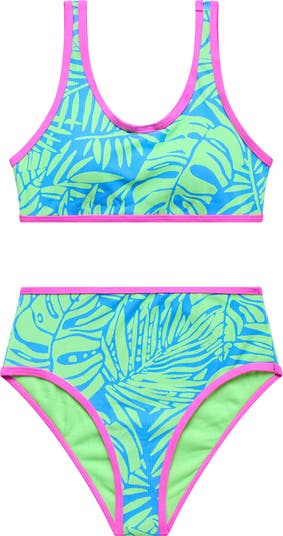 Your kid will love the palm print this ribbed two-piece swimsuit finished with a bold contrast trim..
