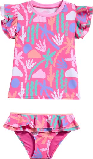 Frilly ruffles trim the top and bottom of a playful two-piece swimsuit that's ready for sunny days at the beach or pool.