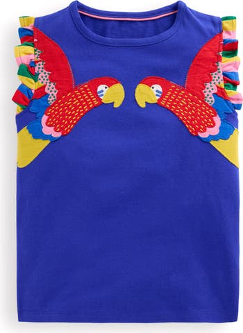 Appliquéd tropical parrots face off on a sleeveless cotton-jersey T-shirt that's accented with colorful striped ruffles at the shoulders.